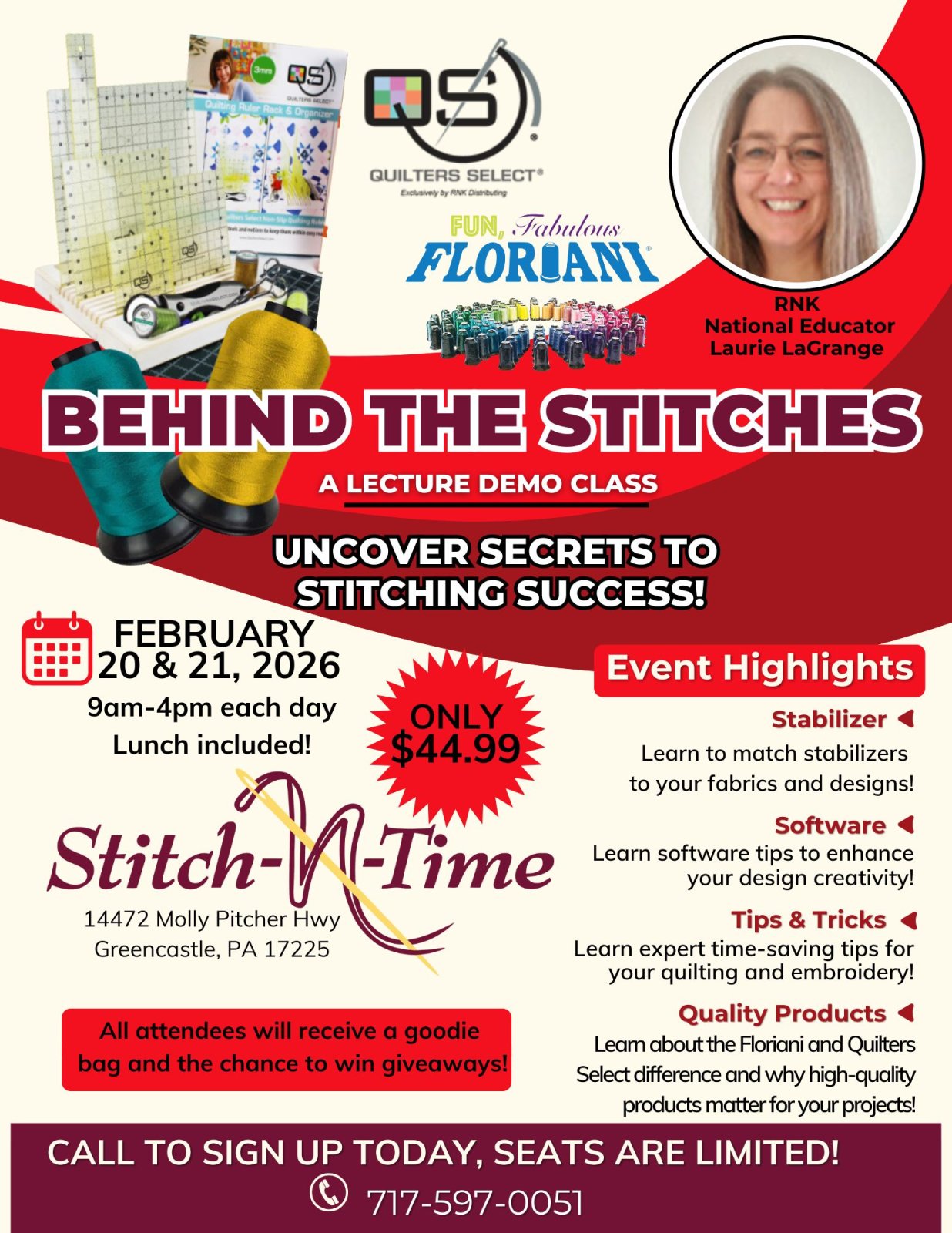 In 2024, Stitch N Time transitioned to new ownership and has continued to grow. We are authorized dealers for BabyLock, Bernina, and Handi Quilter machines, with a fully equipped tech department ready to service and repair all brands.